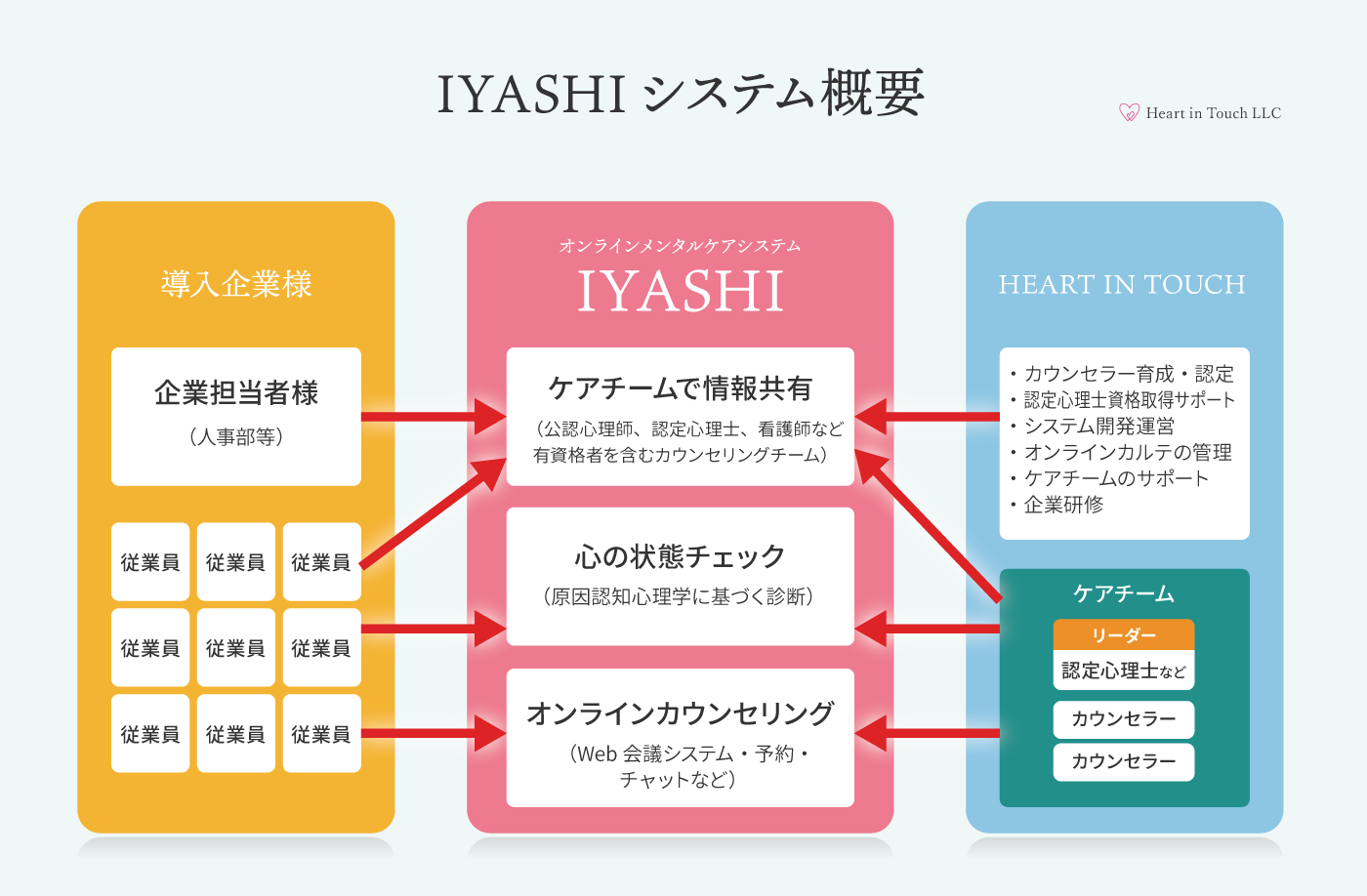 Heart in Touch合同会社の提供するオンラインメンタルケアシステム『IYASHI』は、企業と従業員にとって理想的な、問題の発生を未然に防いで既に発生している問題を解決するための心理専門家の相談窓口です。